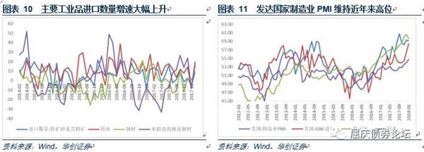 第三,高基数下外贸依然高速增长,内外需均十分强劲。2月8日公布的外贸数据显示,按人民币计,2018年1月同比分别增长6%和30.2%,远超预期。从贸易方式看,进出口一般贸易额增速为18.5%,占比持续上升,表明我国贸易方式结构继续优化。分出口国家来看,1月对发达国家出口增速有所回落,对东盟出口额增速大幅增加至14.8%,成为我国1月份出口增速保持高位的主要原因。分主要贸易商品类别看,出口方面,以美元计价,1月占比最大的机电产品和高新技术产品出口额增速依然维持在高位,而劳动密集型服装和鞋类出口同比增速则继续下滑。进口商品方面,1月份国内进口商品中主要工业品原油、、铁矿砂及其精矿、未锻轧铜及铜材、煤及褐煤进口数量较12月份明显上升,表明1月份国内工业需求较多,预示着1月份工业数据不差。