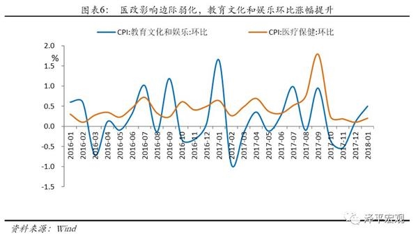 (4)医改影响边际持续减弱,消费升级带动教育文化及娱乐价格上涨。服务方面,医疗保健分项同比涨幅继续回落,同比涨6.2%,涨幅环比降低0.4个百分点,医改边际影响持续减弱。受消费升级影响,教育文化及娱乐价格环比上涨0.5%,涨幅环比提高0.4个百分点。