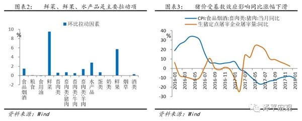 (1)食品价格是1月CPI重要拉动项。食品价格主要拉动力来自于鲜菜、鲜果、水产品。1月受我国大范围雨雪天气影响,鲜菜价格环比上涨9.5%,鲜果价格环比上涨5.7%,明显强于季节性。猪肉价格受去年同期高基数影响,同比降10.6%,降幅有所扩大。1月猪价环比涨幅有所收敛,主要由于压栏情绪缓释,四季度出栏量进一步增加,导致1月下旬猪价出现周度环比下跌。然而生猪存栏量降至5年以来低位,生猪定点屠宰量同比增速降至2.35%,且污染防治作为“三大攻坚战”之一, 2018年环保限产边际不会放松,猪肉供给提升受限。供给收缩叠加基数效应,今年猪价或将成为食品价格重要拉动力,食品价格将成为CPI重要拉动力。考虑春节错位的基数效应,预计2月猪价价格将会大幅上涨,拉动CPI显著上行。
