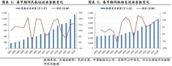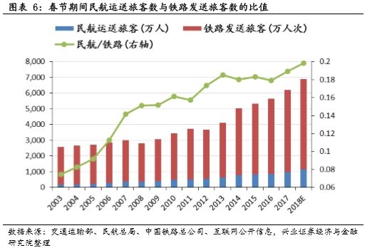根据交通运输部统计的数据,2月15日至21日7天全国民航运送旅客达到1140 万人,同比增长16.10%;全国铁路预计发送旅客5751.6万人次,同比预计增长10.62%,增速均较去年继续增长,其中铁路发送旅客增速连续第三年增长。从相对比值来看,民航发送旅客数与铁路发送旅客数的比值升至接近0.2再创新高,连续第二年提升,表明消费升级的趋势仍在继续。