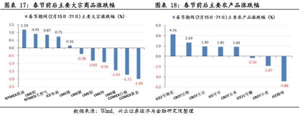 农产品分化比较明显。ICE棉花期货在经历前期持续下跌后,春节期间大涨4.26%,主要是受空头回补的提振。咖啡期货跌幅较大,春节期间下跌4.88%。
