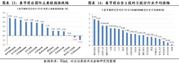 ——股票:普遍上涨。春节期间期间,随着美股大跌后市场情绪的逐步改善,全球股市普遍上涨。受向好及央行行长人选确定的提振,日本股市表现最佳,日经225指数累计上涨3.86%。表现较差的是印度股市,下跌0.91%。在含A股的H股中,家用电器、国防军工、轻工制造、涨幅较好,均超过了4%。