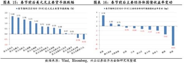 受美国强劲经济数据提振,春节期间美元对多数货币升值。春节前后(2月15日至2月21日)美元兑加元上涨1.68%,美元指数累计上涨1.23%重返90点上方。美元兑新西兰元贬值较大,下跌0.51%。