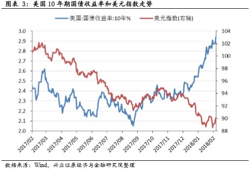 2月21日,美联储公布了1月议息会议纪要。在会议纪要中美联储将未来的加息行为改为“进一步渐进加息”,增加了“进一步”这个措辞。同时纪要还表明几乎所有的美联储委员都预计通胀将升至2%的目标水平,并且同意近期美国经济前景增强的判断。纪要公布后,市场对美联储今年加快加息速度的担忧上升,认为美联储在今年有可能会加息3-4次,甚至预计有可能达到5次。受此影响,美债收益率和美元指数都大幅走高。美债收益率升至2.9%上方,美元指数也升至90点上方。