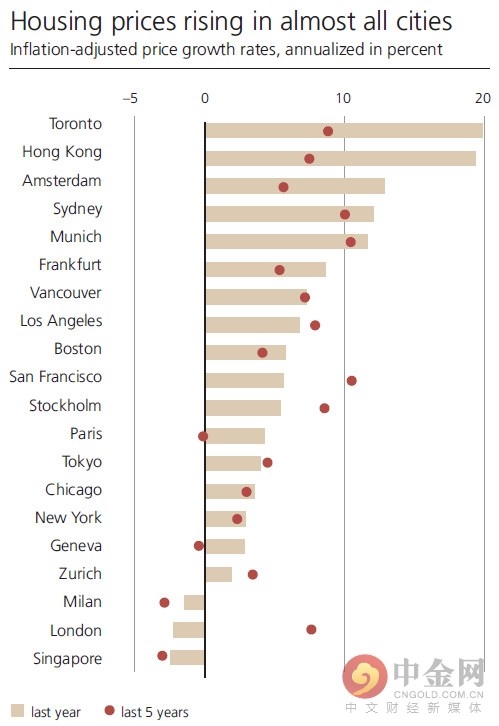 去年,在瑞银追踪的城市中,只有三座主要城市的房价没有明显上涨,它们分别是伦敦、米兰和新加坡。