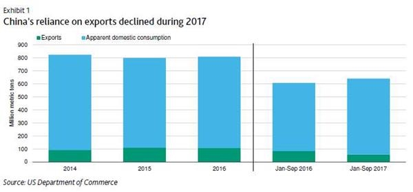 另外,穆迪表示,美国拟对进口钢材征收高额关税,对于亚洲钢铁制造企业影响不会很大。该政策对于中国钢铁业影响也很有限。去年前九个月,中国对美直接钢材出口仅占总出口量的1%或钢材总产量的0.1%。此外,由于国内需求增长和去产能的效果显现,2017年中国钢铁企业对出口的依赖性大幅下降。