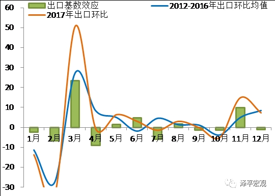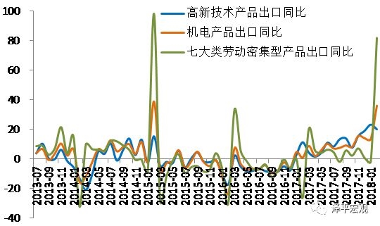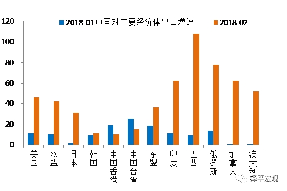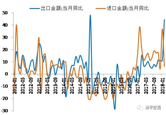 2、因春节错位、外需持续复苏等,2月出口虽受人民币升值压制,但仍大幅超预期。2月出口同比44.5%,较上个月上升33.4个百分点,创2015年2月以来新高。并且,2月人民币汇率明显升值,CFETS人民币汇率指数同比上升2.47%,较1月上升1.9个百分点。出口大幅上升的原因在于:1)春节错位。2017年春节为1月28日,企业往往在正月十五之后才逐渐复工,我们看到2017年2月出口同比-2.4%。而2018年春节为2月16日,在春节前企业抢工出口,春节因素只影响2月中下旬。从基数效应看,2017年出口环比与2012-2016年出口环比均值的差为-6.6个百分点,低于1月的-2.4个百分点。合并1-2月数据看,出口同比为24.4%,较2017年12月上升13.6个百分点。2)外需持续复苏。2月美国、欧元区、日本制造业分别为60.8%、58.6%、54.1%。其中,美国较上月上升1.7个百分点、创2004年5月以来新高;欧元区、日本下降1.0、0.7个百分点,虽然欧日PMI较上月有所回落,但仍处于较高水平。