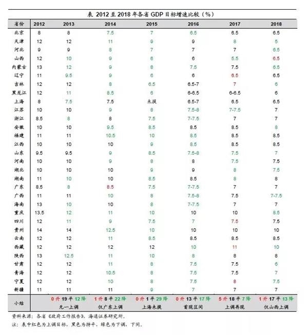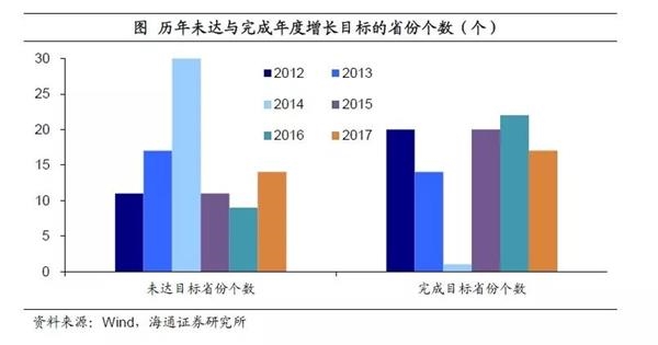 二是经济下行压力加大。从地方经济的实际情况看,17年各省GDP增速7升5平19降,六成以上的省份经济增速出现下滑。而从各省增速目标达成情况来看,17年共有14个省份未完成目标,占比接近半数,超过15年和16年水平。经济数据去水分叠加较高的下行压力,使得地方经济增速目标的下调成为必然。