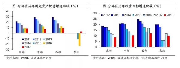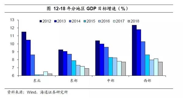 西部省份调整幅度最大。分地区来看,曾上调17年增速目标的地区在18年增速目标上,向下调整的幅度较大,如东北和西部省份,17年目标增速较16年分别上调0.37和0.14个百分点,而在确定18年增速目标时,又分别较17年目标下调了0.27和0.42个百分点,降幅明显高于东部和中部地区。