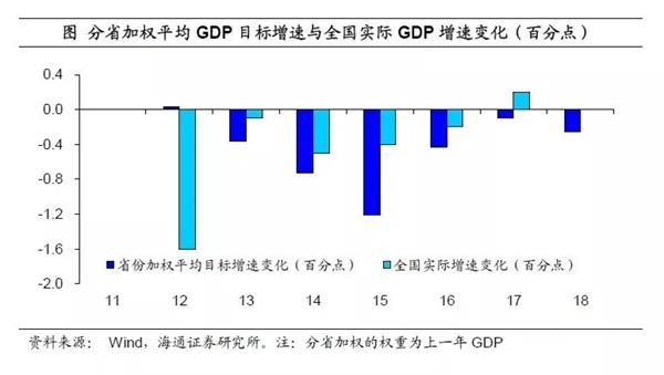 而17年分省经济与全国走势不同,各省预期较为悲观。虽然17年全国GDP增速小幅反弹,但分省GDP加权平均增速和中位数增速均处下行。受此影响,在全国实际增速回升的情况下,18年各省GDP增速目标加权平均值跌幅再度扩大,由17年的-0.1个百分点降至-0.25个百分点。