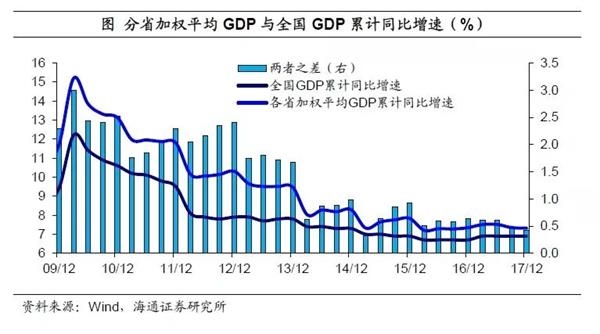 一是经济数据持续“去水分”。伴随着我国经济发展阶段的转变,GDP增速目标的考核逐渐淡化,经济增长更重质量,因此地方政府主动挤出过去经济数据中存在的水分,甩开增长包袱,各省加权平均GDP增速与全国增速之差已降至0.5个百分点以下。