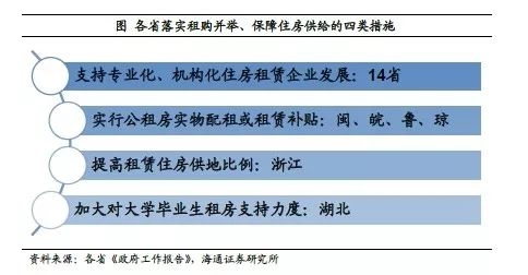 一是租购并举,保障供给。绝大多数省份在其地方两会中响应中央号召,明确“房住不炒”定位,并强调加快构建多主体供应、多渠道保障、租购并举的住房制度,培育发展住房租赁市场特别是长期租赁。具体措施则包括:1)支持专业化、机构化住房租赁企业发展;2)实行公租房实物配租或租赁补贴;3)提高租赁住房供地比例;4)加大住房公积金对大学毕业生等群体租房支持力度。