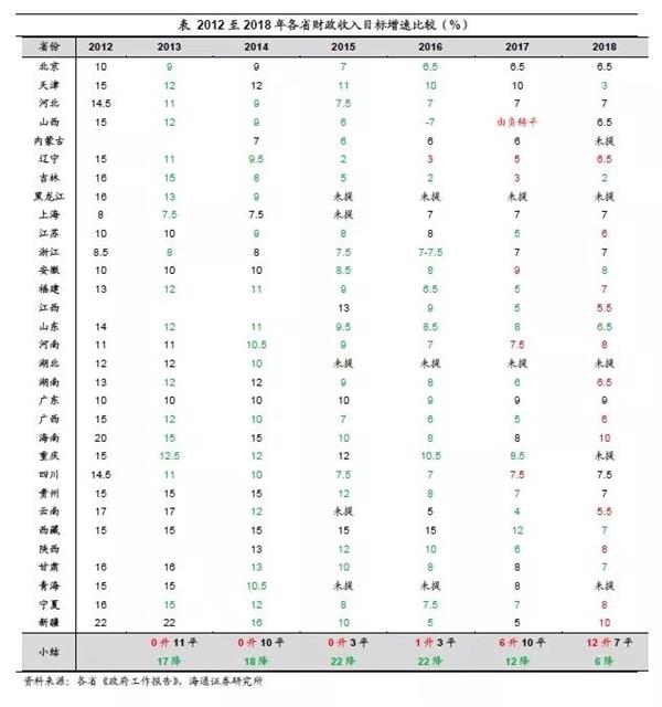 18年各省财政收入目标近半数上调。不同于GDP和投资增速目标的普遍下调,地方政府在制定18年财政收入目标时显得较为乐观。26个省份明确提出了财政收入目标,其中12个省份上调、占比近半,仅6省下调。