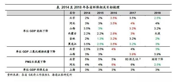 而从18年各省市所确立的环保约束性目标来看,并无省市上调环保目标,与16年和17年约束不断加码的情况不可同日而语。作为能耗大省的东北和华北地区,吉林和黑龙江两省以及北京市均调低18年单位GDP能耗目标,而从北京市单位GDP碳排放和河北省PM2.5浓度目标下调来看,18年华北地区的大气污染排放约束也有所缓和。