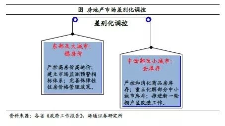 房地产:保障住房供给,调控因城施策。一是租购并举,保障供给,包括支持专业化、机构化住房租赁企业发展,实行公租房实物配租或租赁补贴,提高租赁住房供地比例等措施。二是因城施策,差别化调控,中西部及低线级城市重在去库存,东部及高线级城市重在稳房价。