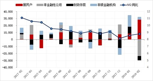财政支出超季节性,M2稳步回升。2月M2小幅反弹0.2个百分点至8.8%,略微好于市场预期。其中财政存款超季节性投放是支撑M2回升的主要因素之一。非银存款同比下降3739亿元,同比增加至较1月份减少1.86万亿,对M2增速造成较大拖累。春节错位影响下,企业存款同比回落,居民存款同比上行。此外,这一错位也也导致了M1大幅跳水6.5个百分点至8.5%。