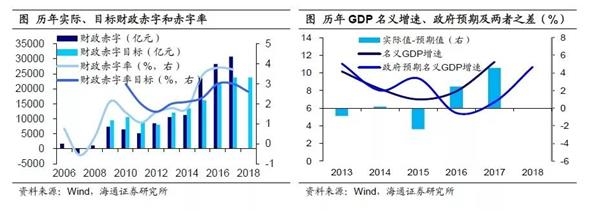 经济反弹带动财政收入改善。根据政府工作报告,调低赤字率,主要因为“经济稳中向好、财政增收有基础”。根据17年政府工作报告中提出的2.38万亿财政赤字及3%的赤字率倒推,17年GDP名义增速应为6.7%,但实际上17年GDP名义增速却高达11.2%,这使得17年实际财政收入明显高于年初政府的预期,也令政府对18年财政收入较为乐观,从而下调财政赤字率目标。事实上,从此前召开的地方两会看,近半数省份上调了18年财政收入增速目标,这也正是对17年低估财政收入的修正。