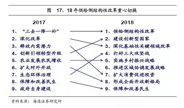 供给侧改革领衔九大工作目标。政府工作报告提出,18年要着重抓好9个方面的工作,与17年相比:1)供给侧改革依然领衔;2)创新居次,顺位较去年大幅提前,反映其重要性明显上升;3)改革从“重要领域关键环节”移步至“基础性关键领域”,意味着改革正持续进入深水区;4)延续去年底中央经济工作会议思路,新增加“三大攻坚战”,且顺位靠前,环保并入其中;5)“农业稳定农民增收”升级为“实施乡村振兴战略”;6)新增加区域协调发展;7)释放内需的顺位大幅调后,符合淡化增长基调。