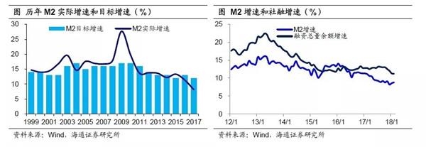 17年货币政策目标稳健中性,实际偏紧。自2011年以来,政府工作报告中对货币政策的表述均为“稳健”,而过去5年M2增速目标也基本在12%、13%之间徘徊,从执行情况看,13-16年间,M2目标增速和实际增速之差也基本保持在1%左右。从17年初的政府工作报告看,货币政策基调也仍然是“稳健中性”,M2增速目标略下调至12%。但实际上17年M2增速却持续回落,从16年底11.3%大跌至17年底的8.2%,远不及年初制定的增速目标。相比之下,社融增速仅从前一年的12.8%微降至12%。