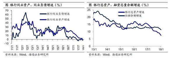 17年:当货币稳健中性遭遇去杠杆。变化发生在17年下半年。首先是7月的金融工作会议,明确提出要推动经济去杠杆,坚定执行稳健的货币政策,处理好稳增长、调结构、控总量的关系。这是政府首次把去杠杆、控总量放在最核心的位置。其次12月初的中央政治局会议,明确表示18年要打赢三大攻坚战,其中去杠杆放在首要位置,而央行也明确表示,货币低增速可能成为常态。而降低货币增速的一个重要环节是抑制货币在金融体系内的自我循环,意味着理财将向净值型转型,表外业务的发展将受到约束,银行同业资产和负债面临双重收缩的压力。