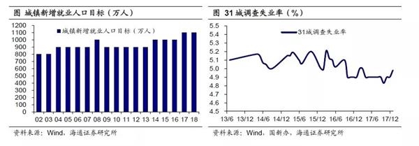 而就业的重要性更加凸显。这表现在两个方面,一是更加明确就业与增长的关系,从17年的“稳增长的重要目的是为了保就业、惠民生”进一步具体为“从经济基本面和就业吸纳能力看”,吸纳就业成为经济增速目标持平的原因之一。二是目标设定更具现实意义,18年新覆盖了调查失业率目标,这一指标更能反映实际就业情况,其意义不亚于16年将社融余额增速纳入货币政策目标。