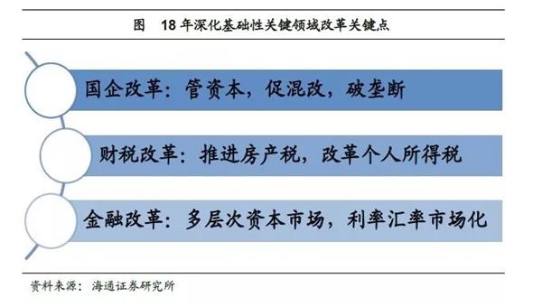 改革向哪深化?改革推向纵深,寻求突破。18年将以改革开放40周年为重要契机,推动改革取得新突破,增强内生发展动力。其中,国企改革的重点在于推进国资投资、运营公司改革试点,以及推进混合所有制改革,而支持民营企业发展势必要求打破国企垄断和行政垄断。财税改革的亮点一是健全地方税体系,推进房产税立法,二是改革个人所得税。金融改革主要有两大变化,一是多层次资本市场改革的重心转为推动债券、期货市场发展,二是较去年增加了深化汇率市场化改革。