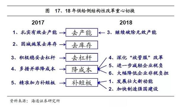 供给侧加还是减?供给侧改革领衔九大工作目标。18年政府工作目标中,供给侧改革仍居首位,其中“发展壮大新动能”和“加快制造强国建设”对应补短板,“继续破除无效供给”对应去产能;“深化放管服”、“进一步减轻企业税负”和“大幅降低企业非税负担”对应降成本。供给侧改革重在补短板、降成本。17年供给侧改革重心在去产能和去库存,强调的是给经济中低效而冗余的部分做减法,而18年供给侧改革的重心在补短板、降成本,强调的是给经济活力做加法,给企业盈利做加法。