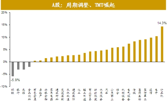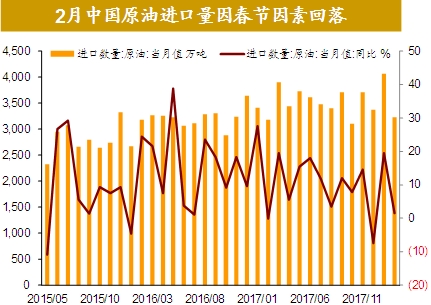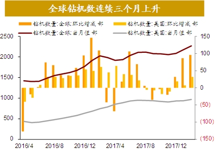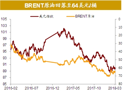 2、在此背景下,国内外商品价格均出现调整,中美股市风格亦趋同,周期股调整,科技股发力。涨幅在全球居前,加之陆股通仍然实现,显示国内市场开放早期海外资本对A股的青睐。BRENT原油下跌至64美元/桶,主因是供需格局的变化:美国原油产量不断创新高,日均产量升至1027万桶,钻机数上升、库存累积,成为的主要利空因素,OPEC发布的月度石油报告中,首次预计来自组织外产商的供给增量超过全球需求增量,库存累积显示的需求状况和预期短期都趋于悲观。同样,国内煤钢库存的累积造成周期品价格大跌,并引发对于节后需求的疑虑。