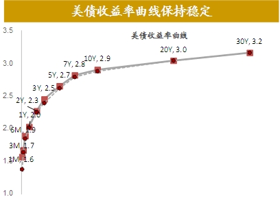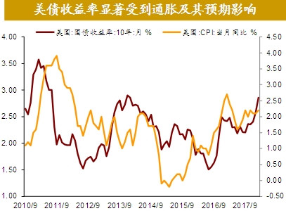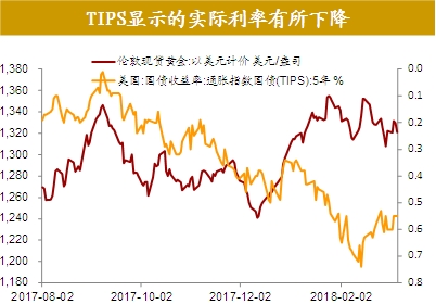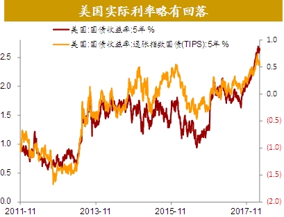 TIPS显示的实际利率近期转为下行,暗示通胀预期或有上升。随着美国连续6个月维持在2%以上和核心通胀略有回升,以及基本面忧虑的上升,TIPS与美债利率走势出现分化。