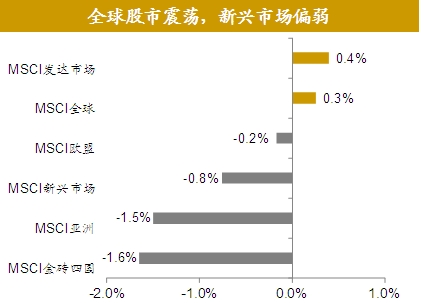 近两周全球股市大幅震荡,新兴市场表现相对弱势,显示全球范围内的风险偏好受到抑制。