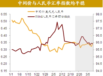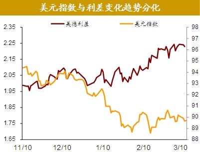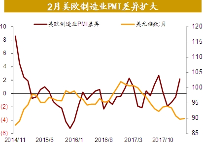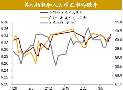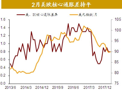 美元指数已连续两个月在90水平震荡,反映基本面、政策面和政治因素的胶着。欧美经济复苏形势暂未改变,欧央行货币政策边际收紧的倾向也没有变化:在3月欧央行议息会声明中,欧央行去掉了“如果展望恶化,将增加购债规模或持续期限”的措辞,进一步释放出鹰派信号,但同时,新美联储主席鲍威尔的态度也较为鹰派。