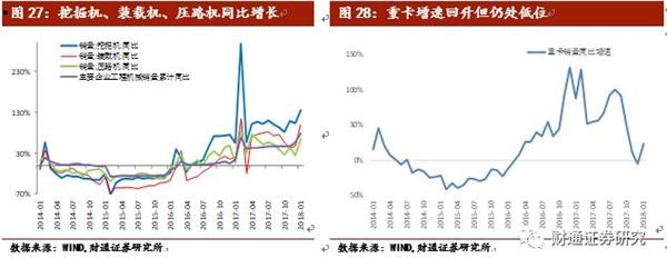 2018年1月主要工程机械销量持续回升,达到69909台同比增长77.56%。挖掘机、装载机、压路机销量分别为10687台、8218台和1039台,同比增长134.98%、98.84%、65.18%。由于2月春节影响,挖掘机2月最新数据显示2月挖掘机销量11113台,同比减少23.52%。1月重卡销量10.08万辆,同比增长23.19%,较上个月的-5.46%大幅回升,但把时间拉长到去年的这个时间点,去年1月、2月基本维持在90%左右的增速,现在的增速仍属低位。