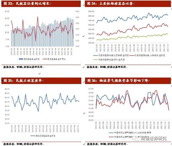 2018年1月民航客运量为0.46亿人,同比增长5.7%,考虑去年1月为春节,今年民航客运量增长可观。2017年11月北京首都机场、上海浦东机场和深圳宝安机场旅客吞吐量分别为810.35、563.88和395.61万人次。2017年12月民航正班客座率小幅下降0.3%至82.2%。空运方面:民航客运量增长可观