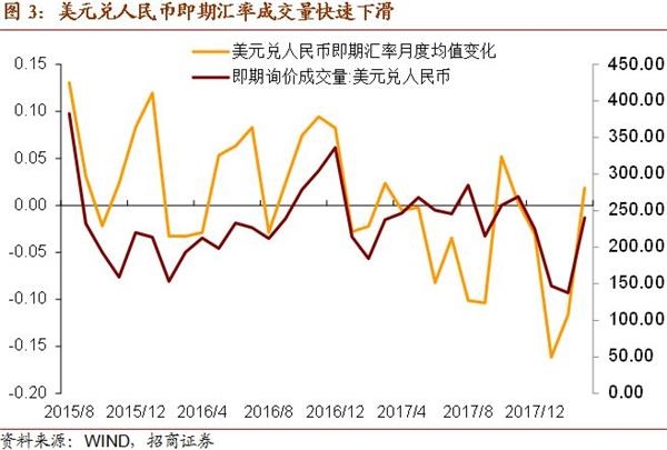 伴随人民币汇率震荡微贬,即期汇率的成交量放大。从月均成交量来看,2018年初人民币汇率在快速升值,伴随美元兑人民币即期汇率成交量快速下滑,即在国内外汇供求相对均衡的状态下,较少的成交对应的价格,推动人民币汇率快速的上升。2-3月随着人民币汇率贬值,即期汇率成交量回归正常值。从历史经验来看,成交量较低的时期往往发生在市场对当时汇率价格纠结、或者说不确定上升时期,比如2015年10-11月、2016年2-3月,2017年的1-2月;成交量放大之后的价格才是经过充分交易检验的价格。