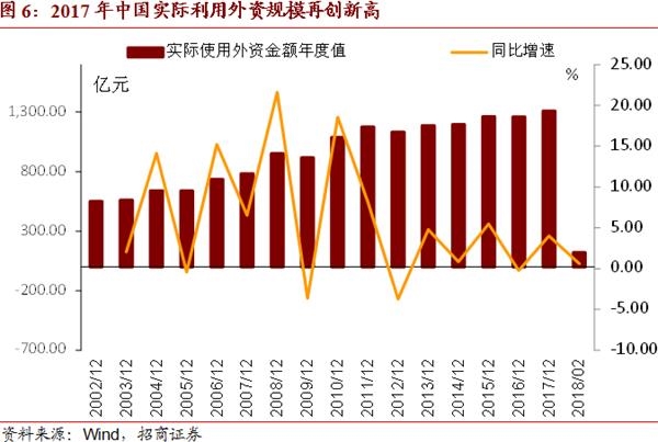 4、外管局局长潘功胜在2月财新专访中提到,随着我国跨境资本流动趋于平衡,前期采取的宏观审慎政策已全部恢复中性。我们在2017年末也指出这一政策趋势。多项数据验证外资持续流入,同时,中国对外投资再次提速,有望带动出口增长。相比2017年受政策影响中国对外直接投资规模萎缩,同比增速降至-29%,2018年前2月对外直接投资同比增速回升至39%。