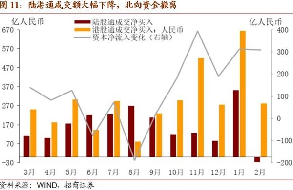 2月南向入规模相比上月亦出现大幅下降,以人民币为单位跌幅将近60%,但仍保持了较高规模。沪市港股通累计流入1219.8亿港币,累计流出975.95亿港币,累计净流入243.8亿港币;深市港股通累计流入430.8亿港币,累计流出344.6亿港币,累计净流入86.2亿港币。