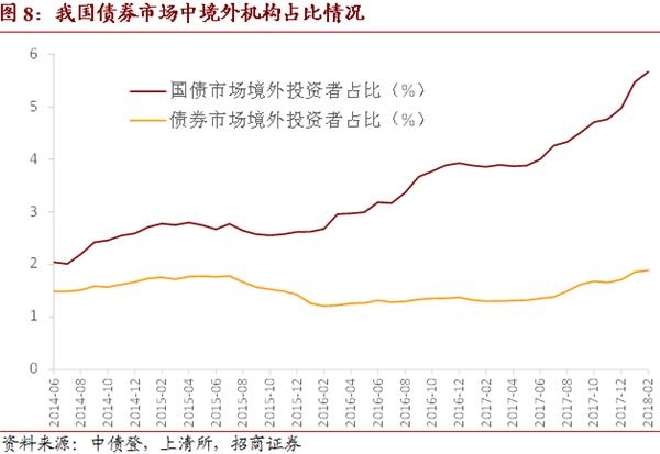 境外机构在中国国债市场的占比快速增长。2月境外机构在我国国债市场中的占比进一步上升至5.66%,前两月已上升0.69个百分点,2017年全年也仅仅抬升了1.04个百分点,境外机构在国债市场的边际影响力预计将越来越明显;在我国债券市场整体之中,境外机构占比同样小幅由1月末的1.85%上升至1.89%,继续创历史新高。目前债券通主要是北向通,南向通的讨论也在进行。具体请参见《买国债卖存单,兼论香港债券市场发展-2月份境外机构债券托管数据点评》