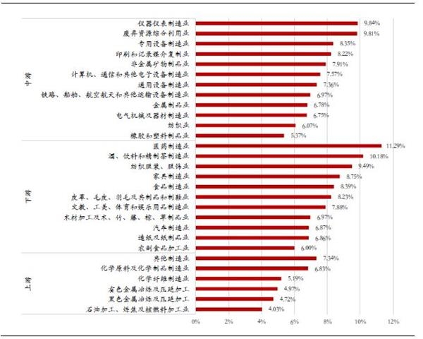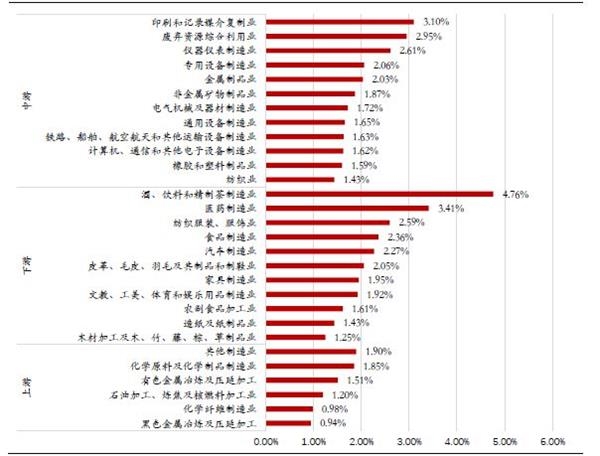从税负率来看,各行业分布相对均匀,上游行业普遍维持在1%-2%之间,中游制造业中电气机械及器材制造业、废弃资源利用业税负率接近3%,下游制造业中酒饮料和精茶制造业、医药制造业税负率较高,分别约为4.8%、3.4%。