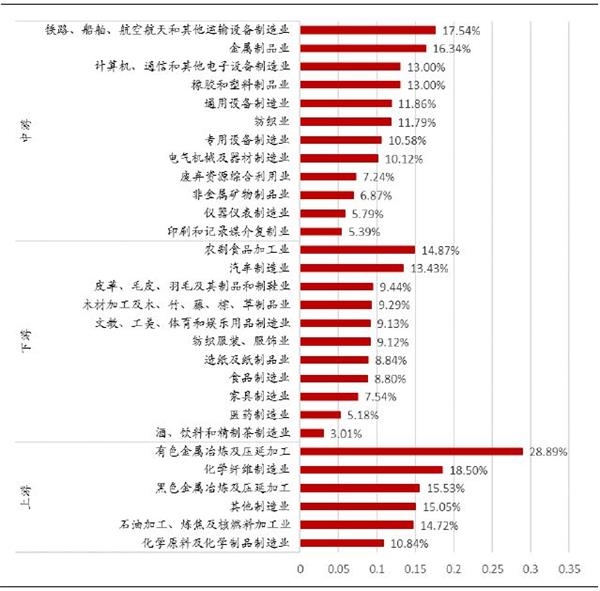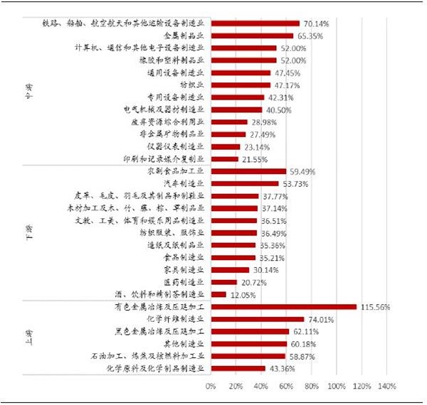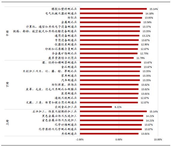 若增值税率下降至13%,有望推动制造业企业净利润总额回升44.8%,其中上、中、下游分别弹升62.8%、44.9%、35.1%,有色金属冶炼及延压加工,化学纤维制造业,铁路船舶航空航天利润弹升最大,分别达到115.6%、74.0%、70.1%。