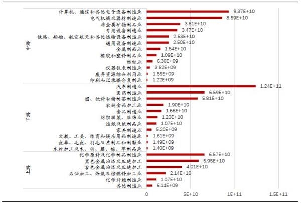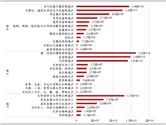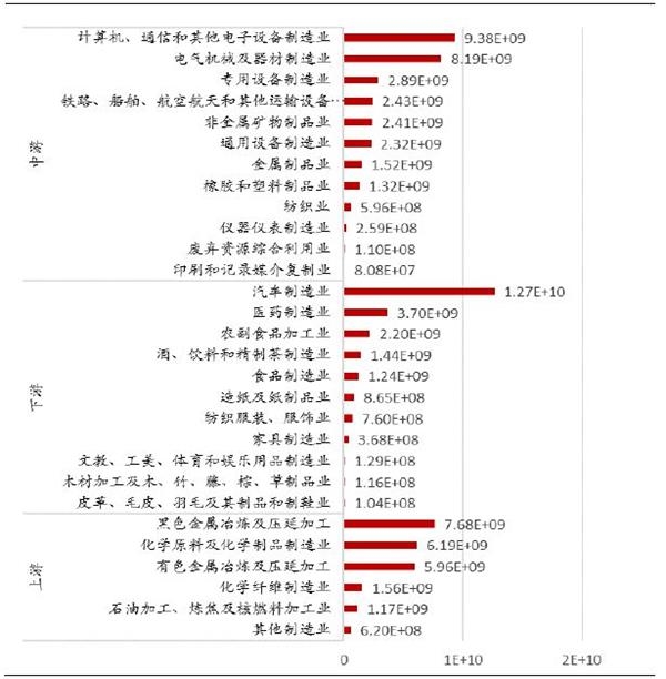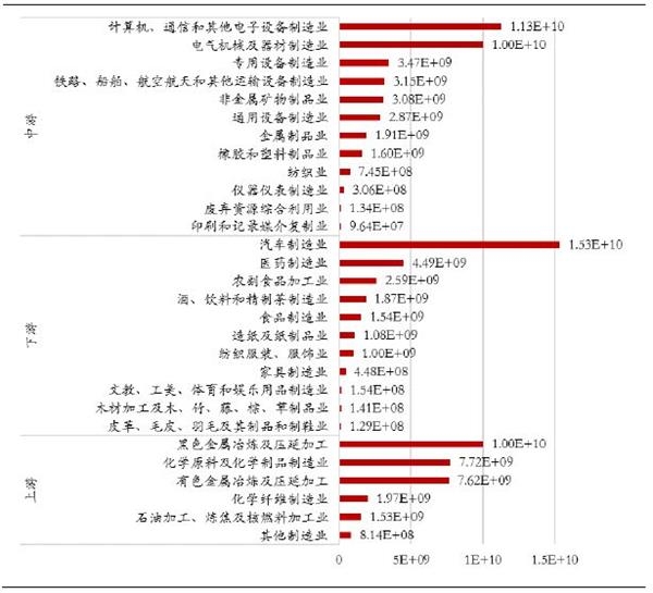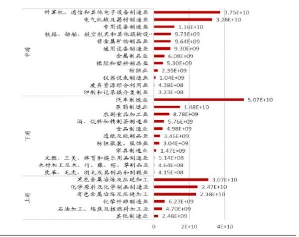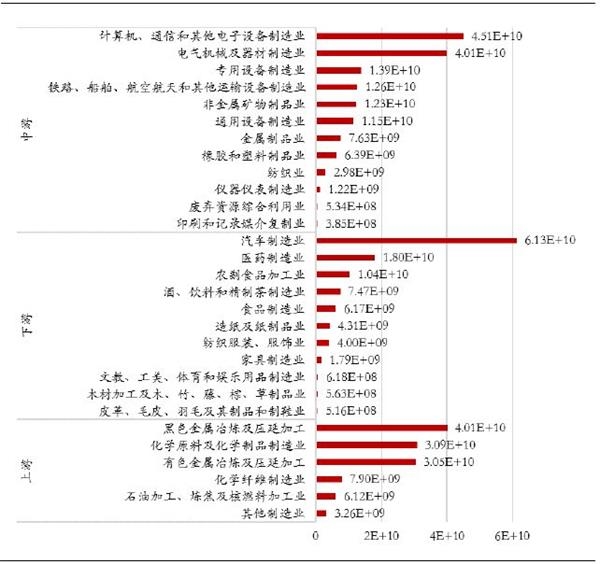 从绝对规模看,上游制造业中化学原料及化学制品制造业、黑色金属冶炼及压延加工业两个行业增值税额最高,达到4500亿左右;中游制造业中,计算机、通信和其他电子设备制造业,电气机械及器材制造业两个行业最高,分别达到7450亿、6430亿元,远高于中游其他制造业;下游制造业中汽车制造业承担了所有制造业行业中最高增值税额,达8970亿元,其次为业,近4600亿元。