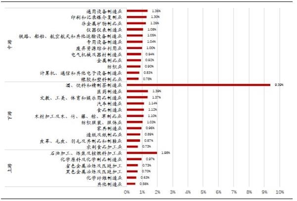 从税负率来看,酒、饮料和精茶制造业税负率远远高于所有其他制造业行业,达9.4%,其他制造业分布在0.5-1.5%区间内。