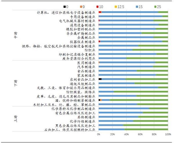 本文参考卢立宇等(2012)、杨志银(2016)等的方法,从投入产出的角度大致估算各个行业的增值税额。基本方法是从投入产出表中测算出制造业各个子行业主营成本的来源和构成比例,并匹配各个部分所对应的增值税进项税率,从而估算出各个行业主营成本中进项税额可抵扣的比例。研究对象为中国A股中2244家制造业(证监会分类)上市公司。时间为2017年前三季度。