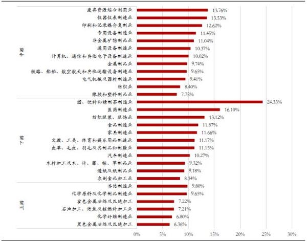 从税负率来看:上、中、下游平均税负率分别为8.7%、10.2%、13.5%,税负率较高的行业为酒饮料和精茶制造业、医药制造业、废弃资源综合利用业、电气机械及器材制造业、服饰业。