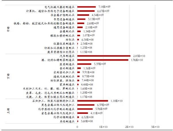 从绝对规模上看,上游制造业中化学原料及化学制品业所得税规模最高,约130亿元,远高于上游其他制造业;中游制造业中同样以电气机械及器材制造业,计算机通信和其他电子设备制造业两个行业最高,分别约为144亿元、126亿元;下游制造业中,酒饮料和精茶制造业、医药制造业、汽车制造业所得税费最高,分别约为162亿、148亿和141亿元。