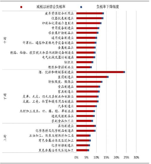 降税以后的综合税负率平均为7.53%,下降近3.3个百分点,其中上游制造业下降3.26%,中游制造业3.33%,下游制造业3.27%。