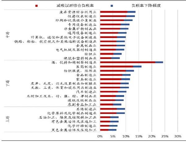 【2】制造业降税超千亿。根据定量测算,剔除增值税下降引发应纳税所得额增加的影响,前三季度制造业有望降税783亿元,折合全年约1044亿元,其中上游降税约309.1亿元,中游降税约420.3亿元,下游降税约