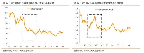 我们观察日元与德国马克在1985年至1987年间的表现,对美元升值幅度是相对接近的。从1985年初至1987年底,美元兑德国马克汇率从3.08贬值至1.57;美元兑日元汇率是则从250贬值至128附近,均接近贬值50%。