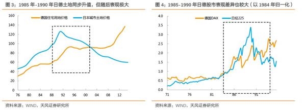 综合来看,无论是权益还是地产价格,日本在1985年后的上行节奏都更快,并进入到加速赶顶阶段,随后崩溃;而德国资产价格基本得到了平稳过度化解(直到下一轮上涨)。