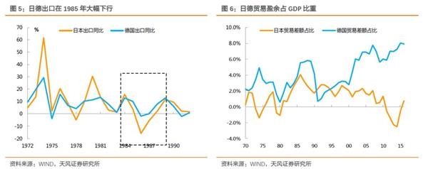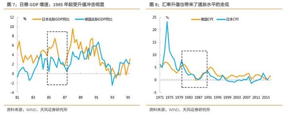 单纯从GDP增速的变动来看,日本受汇率冲击可能更为明显。日本实际GDP增速从1985年的7.5%下降至1987年初的1.6%;而德国GDP增速从1985年的3.5%下降至1987年的低点0.5%,随后在汇率升值速度放缓后两国GDP都出现了反弹。更为明显的GDP下滑可能是日本随后货币金融政策更为宽松的一个原因。