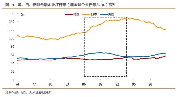 具体说来,日本企业部门杠杆率从1985年至1990年提升了30个百分点,达到了140%以上的绝对高位。同时我们也能看出,在1985年之前,日本企业部门债务率就处于明显高于美国与德国的水平,并且从1985年开始这一水平迅速扩大。